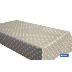 Mantel antimanchas | Color beige con diseño de lunares blancos | Materiales: vinilo y poliéster | Impermeable | Fácil de limpia