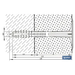 Diámetro de Taladro D: 10 mm | Longitud del Taco LD: 110 mm | Profundidad del Taladro LB: 120 mm | Profundidad Zona Expansión LV: 50 mm | Espesor a Fijar S: 60-70 mm | Piezas por Caja: 200
