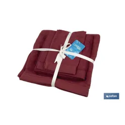 Color: Burdeos | Gama: París | Juego: toalla de manos de 30 x 50 cm toalla de lavabo de 50 x 100 cm y toalla de baño grande de 70 x 140 cm