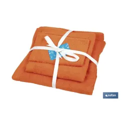 Color: Naranja | Gama: Amanecer | Juego: toalla de manos de 30 x 50 cm toalla de lavabo de 50 x 100 cm y toalla de baño grande de 70 x 140 cm
