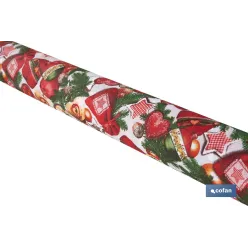 Rollo de mantel resinado antimanchas con adornos y ramas de abeto | Materiales: 75 % algodón y 25 % poliéster | Diseño navideño