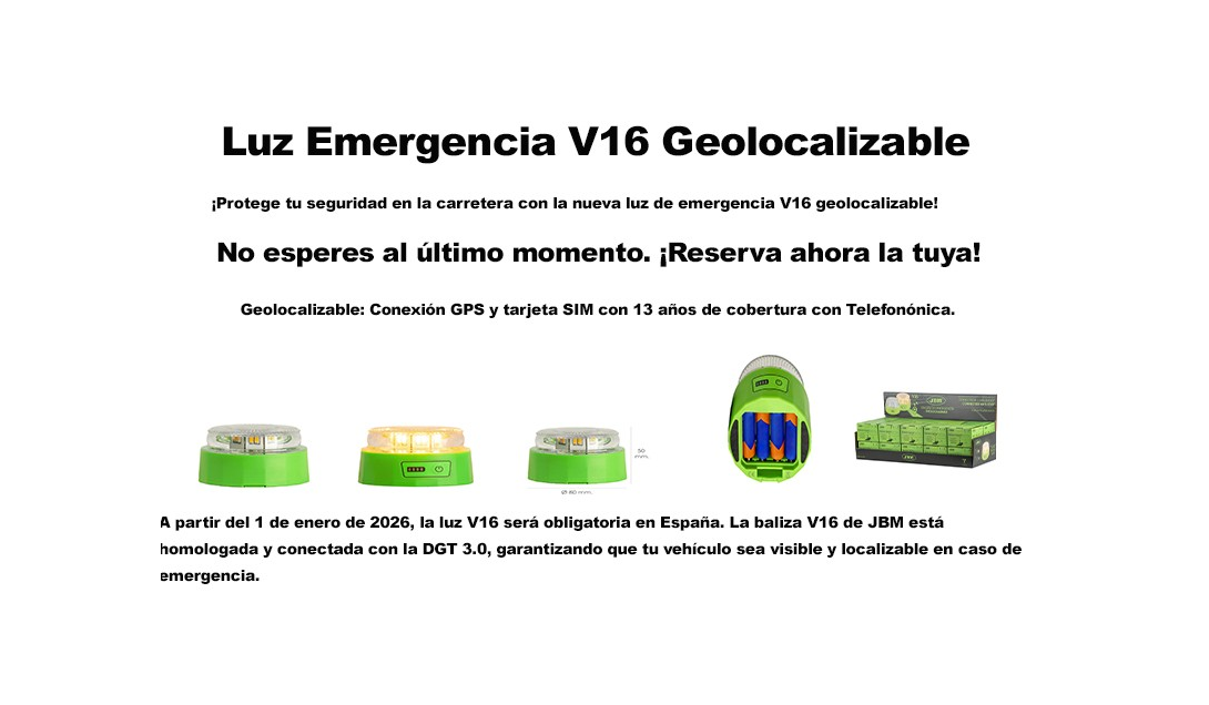 • Ventaja Actual: Aunque la obligatoriedad plena es en 2026, ya puedes utilizar la luz V16 de JBM en lugar de los triángulos desde ahora, aprovechando su comodidad y seguridad.