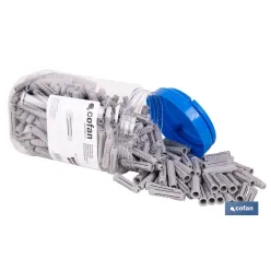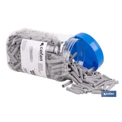 Bote de tacos de fijación de 4 segmentos que ofrecen una fijación firme, segura y polivalente en una gran variedad de materiales base. Fabricados en nylon, estos taco garantizan una expansión óptima y un anclaje fiable incluso en condiciones exigentes, siendo ideal para trabajos profesionales, mantenimiento, instalación y bricolaje doméstico. Su diseño incorpora cuatro segmentos de expansión, lo que mejora la distribución de la carga y asegura una sujeción más estable. Gracias a su collarín y al sistema Anti-Spin, los tacos evitan el giro dentro del taladro durante la instalación, permitiendo un montaje más rápido, cómodo y preciso. El anclaje multimaterial puede aplicarse tanto en soportes macizos (hormigón, piedra, ladrillo macizo, adobe, hormigón celular, etc.) como para soportes huecos (ladrillo hueco, bloque hueco, placa de yeso laminado, placas alveolares, etc.). Además, son compatibles con una amplia gama de fijaciones, como tornillos aglomerados, tornillos avellanados, barraqueros, alcayatas y hembrillas, lo que los convierten en unos complementos muy versátil para infinidad de aplicaciones: instalación de accesorios, fijación de soportes, montaje de elementos decorativos o estructurales, etc.Estos tacos de nylon están disponibles en diferentes tamaños, cada uno suministrado en diferentes cantidades:· 6 x 30 (Ø6 mm), suministrado en botes de 1000 unidades.· 8 x 40 (Ø8 mm), suministrado en botes de 500 unidades.· 10 x 50 (Ø10 mm), suministrado en botes de 300 unidades.Estos formatos permiten abastece tanto a profesionales como a ferreterías, así como a instaladores y empresas de mantenimiento que necesitan disponer de grandes cantidades de forma diaria.