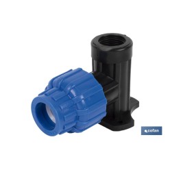 Codo 90° para grifo que incluye una conexión con tuerca azul y una rosca hembra BSP. A esta rosca hembra BSP se le puede acoplar cualquier otro enlace con rosca macho o grifo de misma métrica.Incluye una placa con 3 agujeros para poder acoplarlo a cualquier muro o poste con facilidad.Adecuado para trabajar en sistemas de conducción de agua con una presión nominal de 16 bares.Este codo está fabricado en polipropileno de alta calidad y durabilidad con un acabado de color negro y una tuerca azul.Dispone de una junta de estanqueidad de EPDM que garantiza un ajuste fuerte, duradero y sin fugas.Disponible en diferentes medidas.Puede comprarse en pack o de forma unitaria.