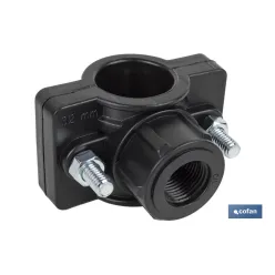 Collarín de toma simple que proporciona una derivación de la línea principal.Adecuado para trabajar en sistemas de conducción de agua con una presión nominal de 16 bares. Este collarín de toma simple está fabricado en polipropileno de alta calidad y durabilidad con un acabado de color negro. Incluye fijaciones para un ajuste fuerte, duradero y sin fugas.Disponible en diferentes medidas. Puede comprarse en pack o de forma unitaria.