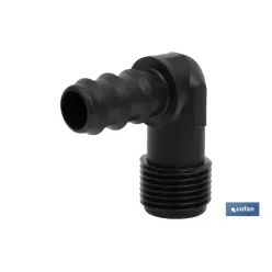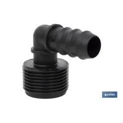 Conector en forma de Codo y rosca para mangueras especial para riego por goteo o aspersión. Su uso está recomendado para jardinería y agricultura. Su diseño permite un uso fácil para adaptarlo a mangueras o tubos de riego. Gracias al conector de empalme mixto se pueden llevar a cabo distintos tipos de riego sin necesidad de herramientas adicionales. Está fabricado en material resistente y diseñado para ser utilizado bajo condiciones meteorológicas adversas. Su montaje es fácil de llevar a cabo. La rosca de uno de sus extremos es consistente y habilita un roscado fijo y fuerte.