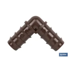Conector en Codo para riego por goteo ideal para agricultura y jardinería. Diseñado para tubos de 16 mm. Su diseño estriado permite su fácil montaje, sin necesidad de herramientas adicionales, uniendo tramos de manguera sin riesgo de fugas. Gracias al conector de Codo se pueden llevar a cabo diferentes tipos de combinaciones, adaptándose a los distintos tipos de riego. Este producto es perfecto para realizar combinaciones en las conexiones de un sistema de riego. El uso de conexiones en codo es fundamental para generar circuitos funcionales en los sistemas de riego de la agricultura y jardinería. Su material es resistente y aporta al producto la resistencia suficiente para que sea funcional en escenarios donde las condiciones medioambientales sean adversas.