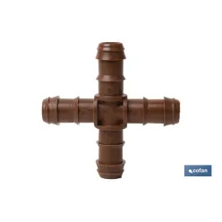 Conector en cruz para riego por goteo ideal para agricultura y jardinería. Su diseño estriado permite su fácil montaje, sin necesidad de herramientas adicionales, uniendo tramos de manguera sin riesgo de fugas. Gracias al conector de cruz se pueden llevar a cabo diferentes tipos de combinaciones, adaptándose a los distintos tipos de riego. Este producto es perfecto para realizar combinaciones en las conexiones de un sistema de riego. El uso de conexiones en cruz es fundamental para generar circuitos funcionales en los sistemas de riego de la agricultura y jardinería. Su material es resistente y aporta al producto la resistencia suficiente para que sea funcional en escenarios donde las condiciones medioambientales sean adversas.