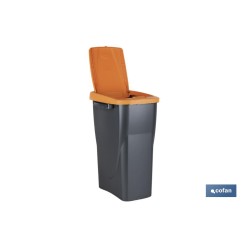 Cubo de reciclaje naranja con tapa manual que puede abrirse y cerrarse mediante pulsador. Adecuado para reciclar residuos orgánicos como los restos de alimentos (cáscaras de fruta, espinas de pescado, etc.).Fabricado en polipropileno de color gris con una tapa de color naranja. El cubo de reciclaje puede unirse lateralmente, mediante un anclaje, a otros cubos de varios colores para crear así una estación de reciclaje. Son adecuados para el hogar, así como para colegios, oficinas, cocinas y talleres de cualquier modalidad. Sus dimensiones permiten que este cubo encaje en cualquier lugar y ambiente, por lo que puedes utilizarlo en cualquier lugar que desees, ya sea cocina, hogar, oficina o jardín. Adecuado para interiores y exteriores. De fácil limpieza y mantenimiento.Disponible en tres medidas a elegir: 20 x 31 x 42 cm (con 15 litros de capacidad), 21,5 x 36 x 51 cm (con 25 litros de capacidad) y 36,5 x 36 x 51 cm (con 45 litros de capacidad).