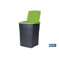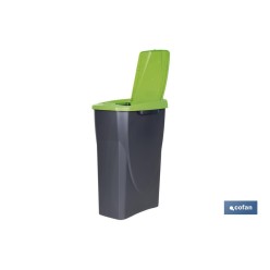 Cubo de reciclaje verde con tapa manual que puede abrirse y cerrarse mediante pulsador. Adecuado para reciclar materiales de vidrio.Fabricado en polipropileno de color gris con una tapa de color verde. El cubo de reciclaje puede unirse lateralmente, mediante un anclaje, a otros cubos de varios colores para crear así una estación de reciclaje. Son adecuados para el hogar, así como para colegios, oficinas, cocinas y talleres de cualquier modalidad. Sus dimensiones permiten que este cubo encaje en cualquier lugar y ambiente, por lo que puedes utilizarlo en cualquier lugar que desees, ya sea cocina, hogar, oficina o jardín. Adecuado para interiores y exteriores. De fácil limpieza y mantenimiento.Disponible en tres medidas a elegir: 20 x 31 x 42 cm (con 15 litros de capacidad), 21,5 x 36 x 51 cm (con 25 litros de capacidad) y 36,5 x 36 x 51 cm (con 45 litros de capacidad).