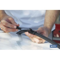 Escobilla limpiaparabrisas flexibles y silenciosas fabricadas con 100% goma natural, máxima calidad de barrido, resistentes al ozono, calor, hielo y nieve. Adaptadores para el 95% de los vehiculos.