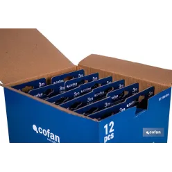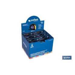 Expositor para flexómetros con protección de goma de Cofan, una herramienta esencial para cualquier ferretería o tienda de suministros industriales que busca ofrecer a sus clientes productos de medición de alta calidad y durabilidad. Estos expositores vienen equipados con 12 o 6 flexómetros, según las características del flexómetro. Están diseñados para soportar las condiciones más exigentes, proporcionando precisión y resistencia. Están fabricados en cartón y cuentan con unas medidas de: 04500933 (21,8 x 24,5 x 15,3 cm), 04500934 (21,8 x 27,5 x 15,3 cm), 04500935 (21,8 x 27,5 x 15,3 cm), 04500936 (21,8 x 15,6 x 15,3 cm), 04500937 (21,8 x 17,5 x 15,3 cm) y 04500938 (21,8 x 18,5 x 15,3 cm). El expositor en sí está diseñado para ser compacto y eficiente, permitiendo una fácil organización y acceso a los flexómetros. Con capacidad para 12 o 6 unidades, es perfecto para mostradores de tiendas, asegurando que los clientes puedan ver y acceder fácilmente a los productos. Características del flexómetro con protección de goma de Cofan. Cada flexómetro en el expositor cuenta con una carcasa resistente de ABS recubierta de goma, lo que proporciona una protección antichoque superior. Esta característica es crucial para prevenir daños causados por caídas o golpes, asegurando que el flexómetro mantenga su precisión y funcionalidad a lo largo del tiempo. Están equipados con un pulsador de bloqueo de la hoja que permite una fijación segura durante el uso. Este mecanismo asegura que la hoja no se retraiga inesperadamente, proporcionando mediciones precisas y seguras en todo momento. Las hojas del flexómetro son de 16 mm, 19 mm, 25 mm o 32 mm de ancho y está recubierta en color amarillo mate, lo que facilita la lectura en condiciones de poca luz. Además, el gancho en el extremo de la hoja asegura una sujeción firme y estable en cualquier superficie, permitiendo mediciones precisas en diversas situaciones. La longitud del flexómetro puede ser de 3 m, 5 m, 8 m o 10 m. Incluyen una correa para colgar, lo que facilita su transporte y uso en el lugar de trabajo.