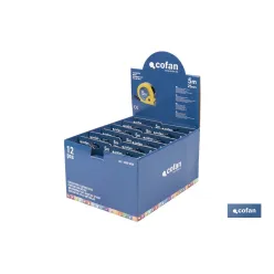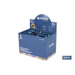 Expositores para flexómetros de Cofan, una herramienta esencial para cualquier ferretería o tienda de suministros industriales que busca ofrecer a sus clientes productos de medición de alta calidad y durabilidad. Están diseñados para soportar las condiciones más exigentes, proporcionando precisión y resistencia. Están fabricados en cartón y cuentan con unas medidas de: 04500954 (18,5 x 21,6 x 13,7 cm), 04500955 (22,0 x 23,8 x 15,5 cm), 04500956 (22,0 x 28,0 x 15,5 cm) y 04500957 (14,2 x 22,2 x 15,6 cm). Los expositores en sí están diseñados para ser compactos y eficientes, permitiendo una fácil organización y acceso a los flexómetros. Con capacidad para 12 o 6 unidades, son perfectos para mostradores de tiendas, asegurando que los clientes puedan ver y acceder fácilmente a los productos. Los propios flexómetros están equipados con un pulsador de bloqueo de la hoja que permite una fijación segura durante el uso. Este mecanismo asegura que la hoja no se retraiga inesperadamente, proporcionando mediciones precisas y seguras en todo momento. La hoja de los flexómetros está disponible en diferentes medidas 16 mm, 19 mm o 25 mm de ancho y está recubierta en color amarillo mate, lo que facilita la lectura en condiciones de poca luz. Además, el gancho en el extremo de la hoja asegura una sujeción firme y estable en cualquier superficie, permitiendo mediciones precisas en diversas situaciones. La longitud del flexómetro puede ser de 3 m, 5 m u 8 m. Incluyen una correa para colgar, lo que facilita su transporte y uso en el lugar de trabajo.