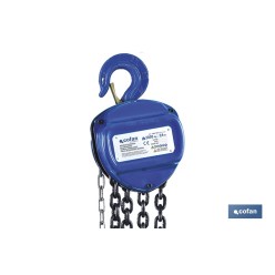 Altura de elevación: 6 m | Capacidad de carga: 1000 kg | Tipo de cadena: cadena de grado 80 | Color: azul | Material: acero | Material del gancho: aleación de acero | Medidas: 14 x 12 x 25 cm | Peso: 13 kg