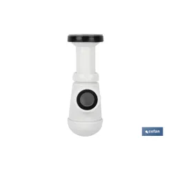 Sifón botella extensible. Racor de 1 1/2. Alta capacidad de desagüe. Tiene una toma de salida de Ø40 mm y una junta cónica reductora de Ø32 mm. Fabricado en Polipropileno de alta calidad y materiales anti calcáreos que permiten una mayor duración y menor desgaste del sifón.
