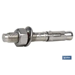 Anclaje MTC estándar para montajes, indicado para placas de hormigón y piedra natural resistente a la compresión. Incluye arandela DIN-125. Medidas desde M-6 hasta M-16 mm y longitudes de hasta 160 mm. Anclaje macho de expansión para cargas altas en acero inoxidable con tuerca y arandela en la fijación. El anclaje es un anclaje de acero inoxidable para fijaciones en hormigón no agrietado. En la versión corta es adecuado para montaje y empotrado de módulos o elementos. De acero galvanizado se recomienda el anclaje de pernos para barandillas, pasamanos o consolas en interiores.